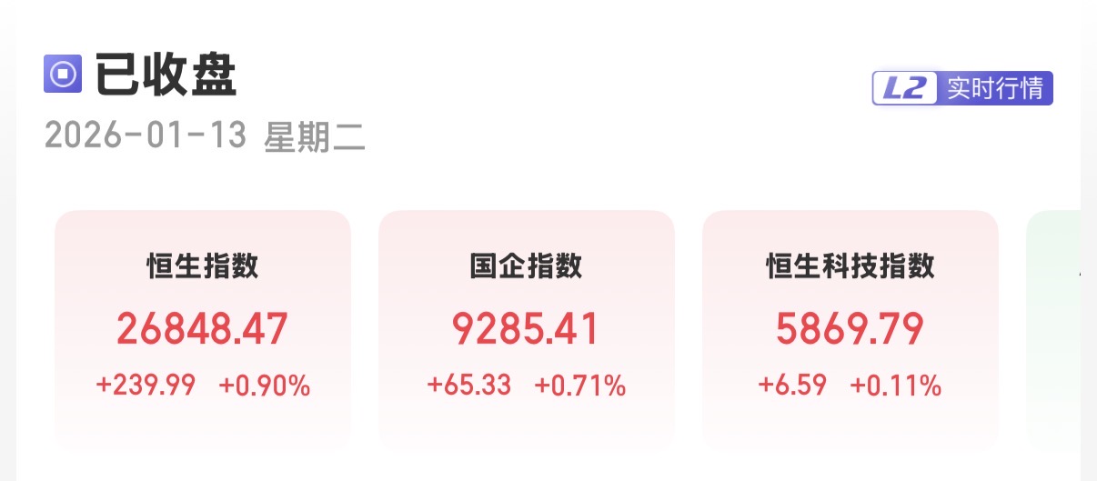 上证报中国证券网讯(卢伊 记者 严晓菲)1月13日,港股三大指数集体上涨。截至收盘,恒生指数涨0.90%,报26848.47点;恒生国企指数涨0.71%,报9285.41点;恒生科技指数涨0.11%,报5869.79点。