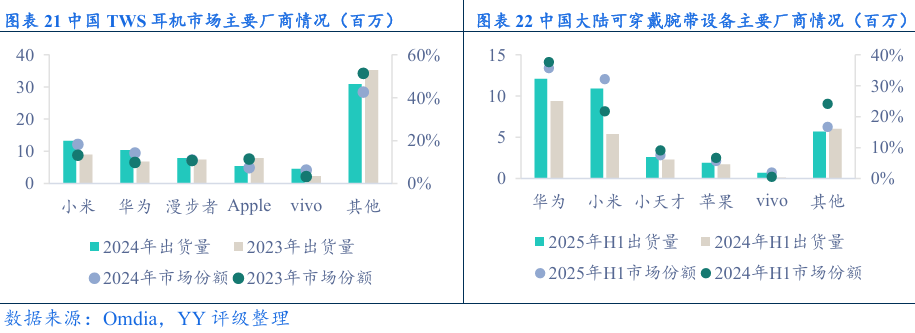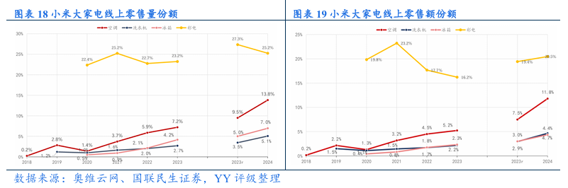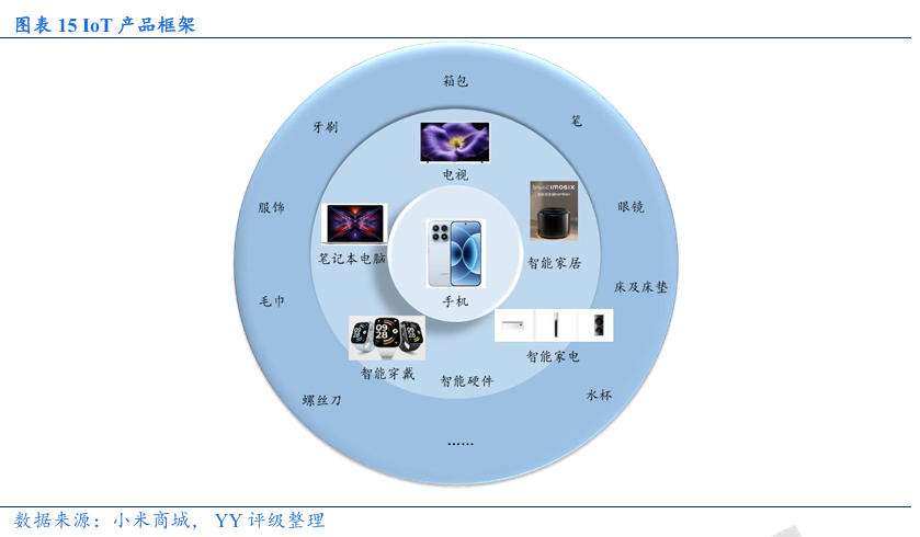 IoT与生活消费品:小米是全球领先智能物联网平台,产品形成“1+4+N”布局,随着小米“人家车全生态”闭环,业务间的协同效应优势将进一步体现。小米设备的连接规模持续提升,小米家居日常生活的使用率不断提高。小米家电凭借低价优势,市占率不断提升,TWS耳机和可穿戴腕带设备均处于行业领先地位。虽然小米家电凭借低价有一定的竞争优势,但仍面临龙头企业的竞争压力,同时随着国补政策退坡,小米IOT和生活消费品业务或将面临一定增长压力。