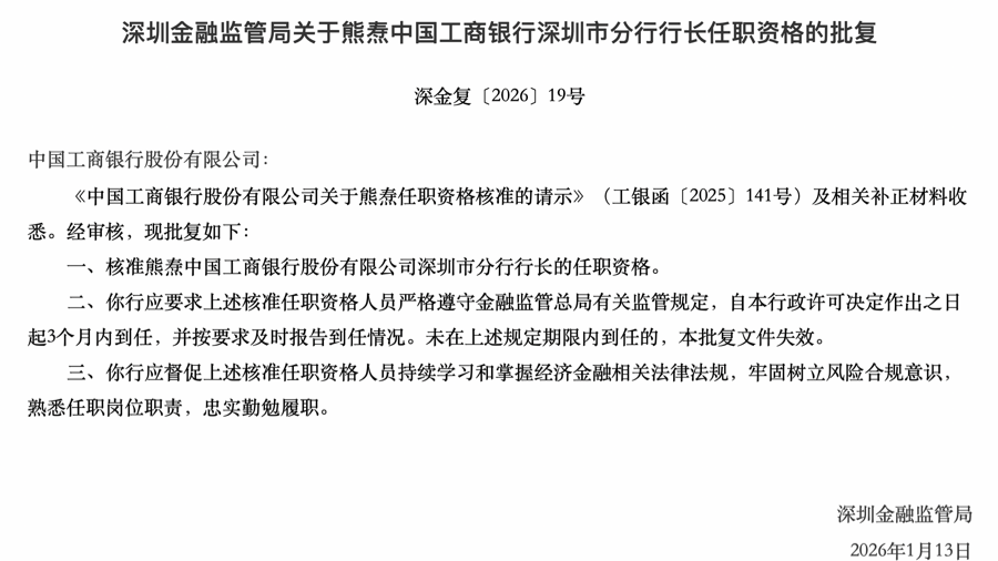 近日,深圳金融监管局发布一则批复:核准熊焘中国工商银行(601398)深圳市分行行长的任职资格。