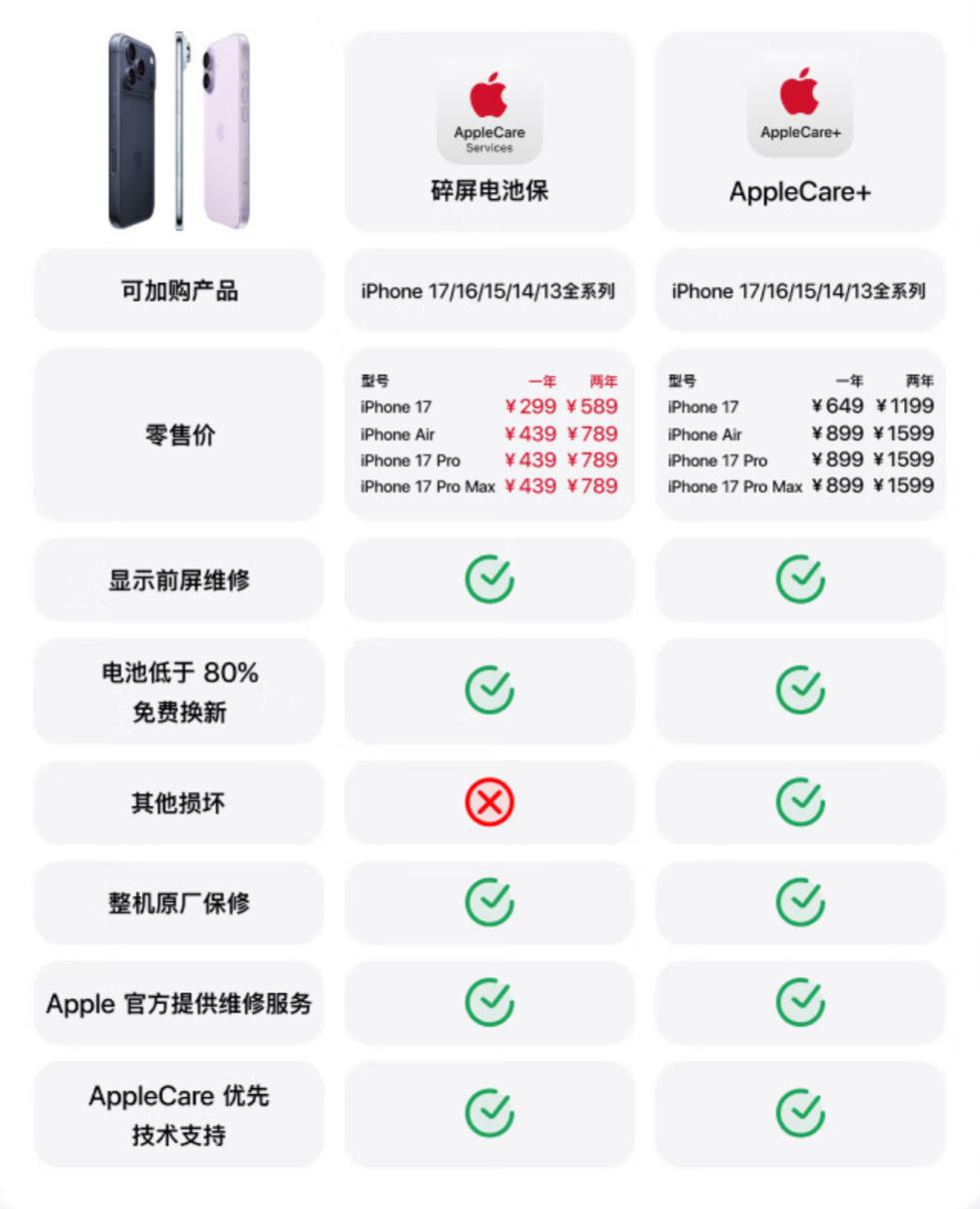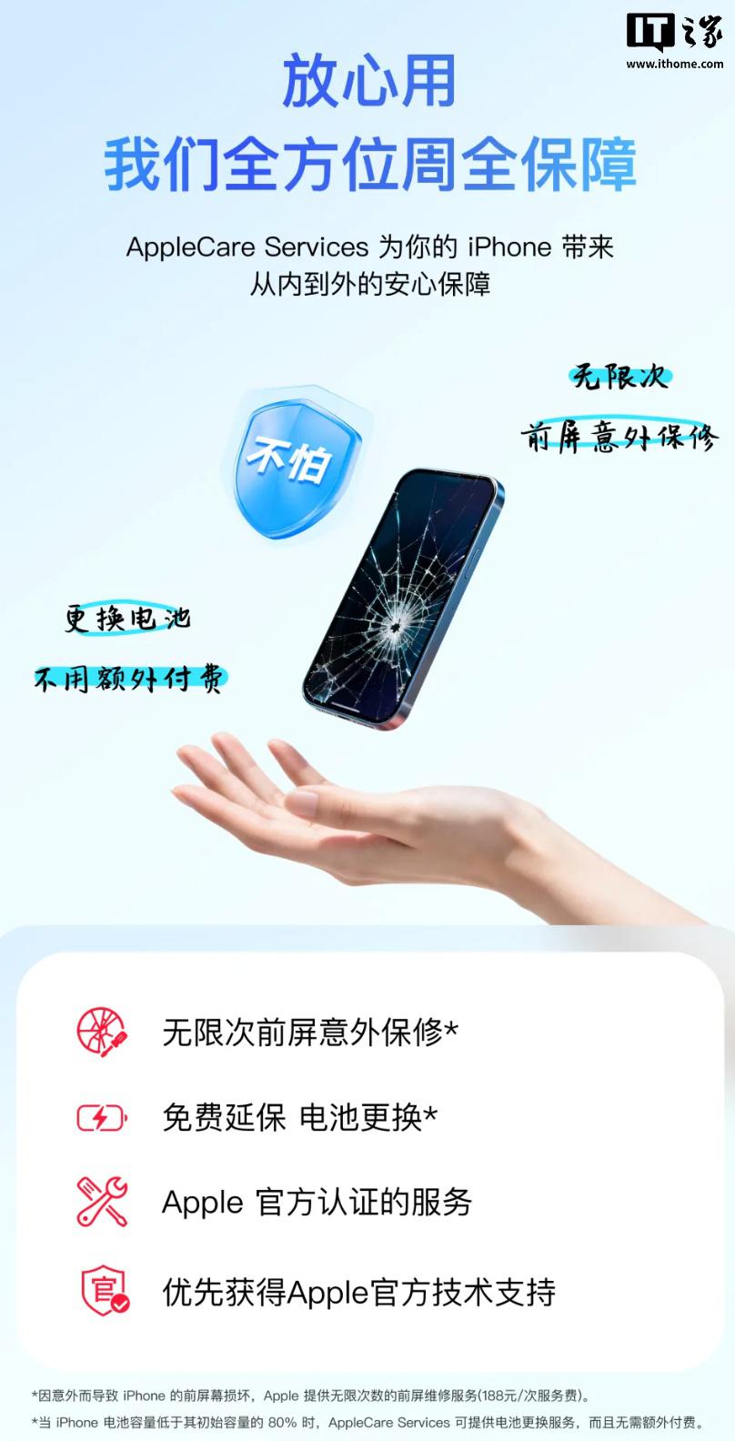 IT之家注:“AppleCare Services”服务并非 AppleCare +,相应服务支持“无限次前屏意外保修(188 元 / 次服务费)”、“免费延保电池更换(健康度低于 80% 免费换)”。