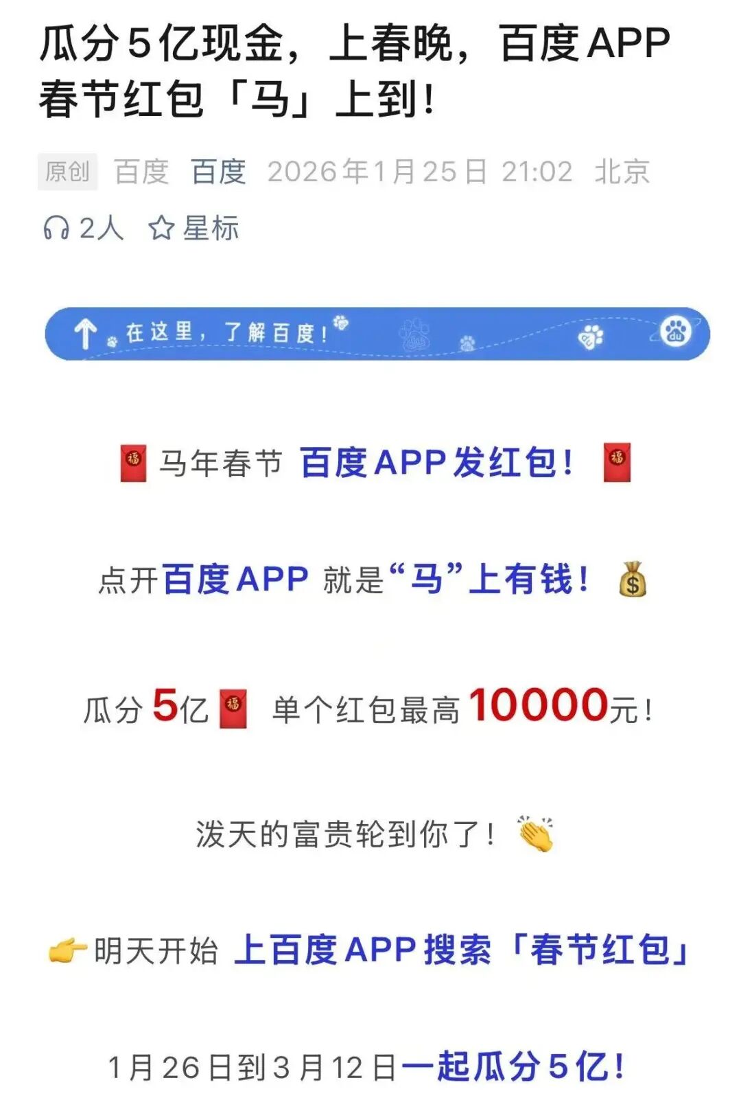 春节抢红包!腾讯元宝,将发放10亿元;百度将发放5亿元