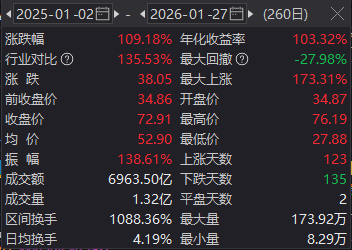 2025年1月至今的一年多时间里,赣锋锂业累计上涨109%,最新股价为72.91元/股,最新总市值超过1500亿元。