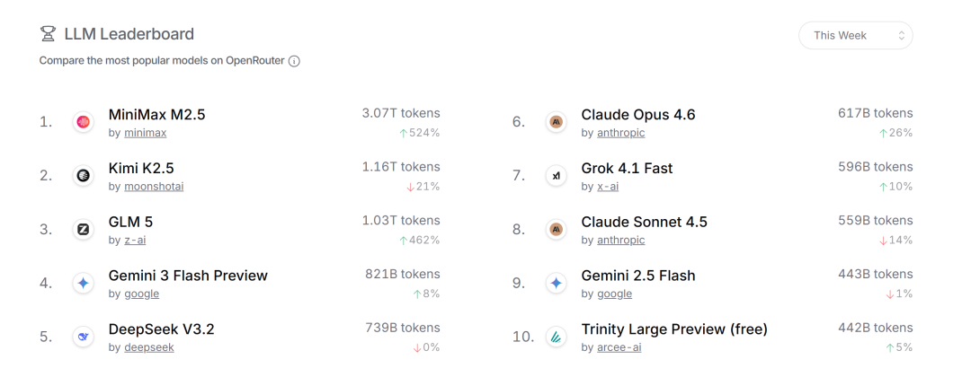 OpenRouter最新数据还显示,MiniMax M2.5是本周调用量最大的模型,调用量达到了3.07T tokens,环比增长524%;GLM 5排名第三,调用量达1.03T tokens,环比增长462%。