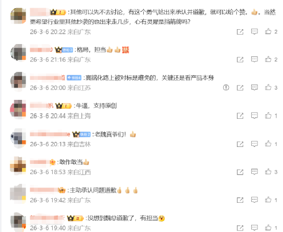对于此次魏建军公开道歉,网友纷纷表示:“魏总自己发视频道歉,太实在了!”“敢作敢当”“道歉很诚恳”。