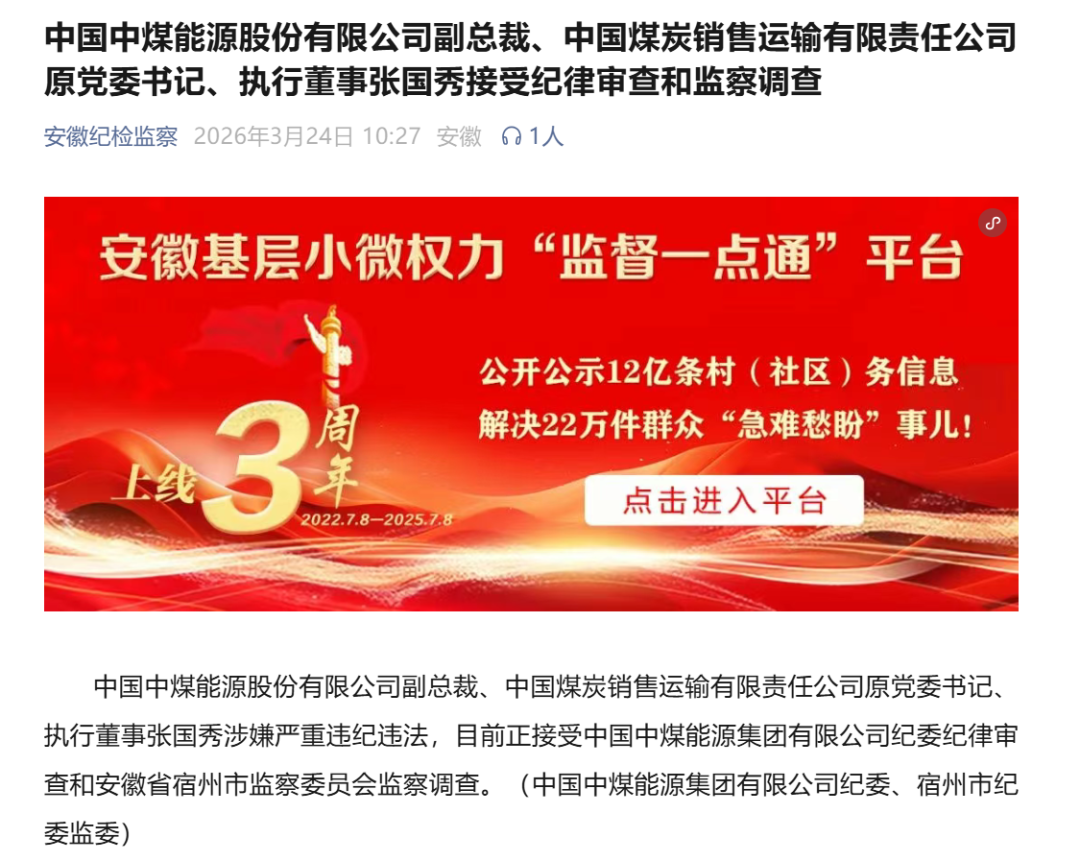 此外,3月24日,安徽纪检监察网还通报称,中煤大同能源(850101)有限责任公司党委书记、董事长张仲清涉嫌严重违纪违法,目前正接受中国中煤能源(601898)集团有限公司纪委纪律审查和安徽省宿州市监察委员会监察调查。
