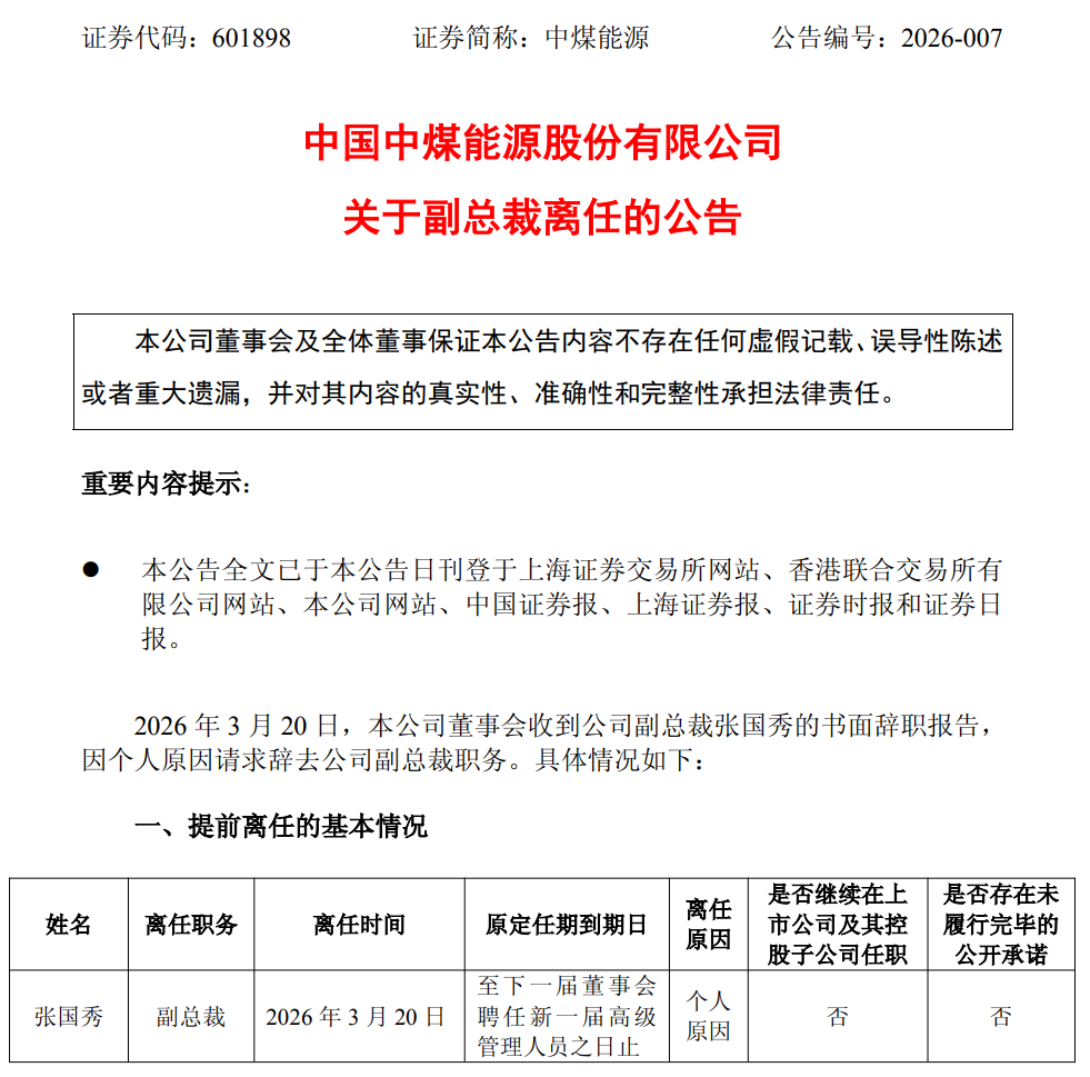 3月20日盘后,中煤能源(601898)发布公告称,董事会于当日收到公司副总裁张国秀的书面辞职报告,张国秀因个人原因请求辞去公司副总裁职务。