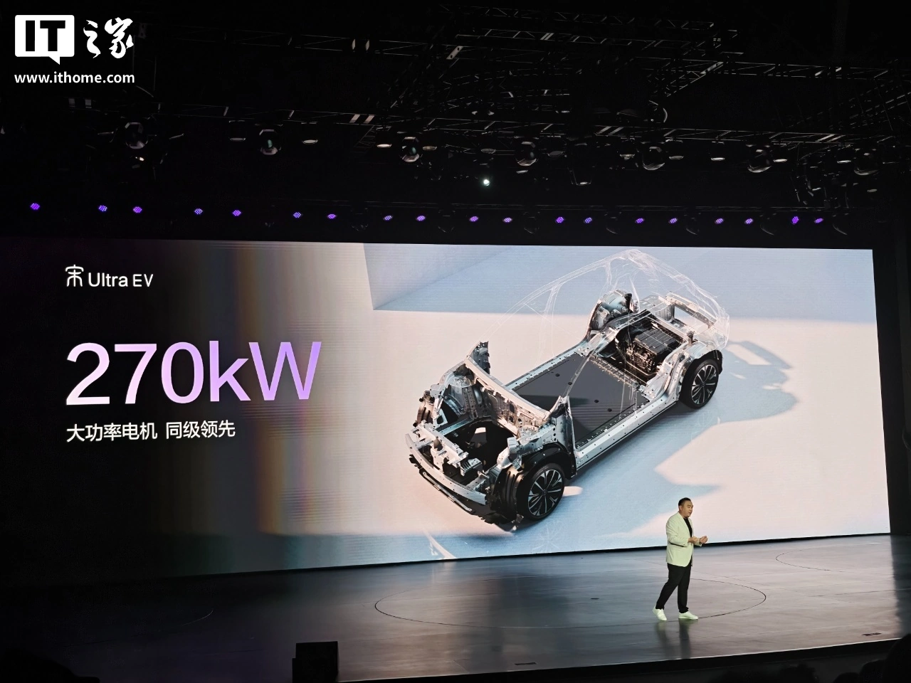 宋 Ultra EV 全系采用后置后驱动力,电机最大功率为 270kW,最高时速可达 210km/h。