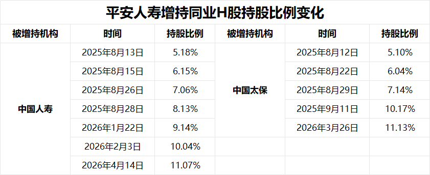 根据港交所披露的数据,平安人寿自2025年8月首次举牌(885587)中国人寿(HK2628)H股、中国太保(HK2601)H股以来,已多次增持,持股比例均提升至10%以上。