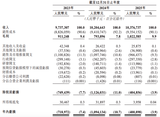 于往绩记录期,圆心科技的财务表现持续改善。招股书显示,圆心科技2023年~2025年营收分别为97.37亿元、102亿元、103.76亿元;毛利分别为9.11亿元、7.94亿元、10.23亿元;毛利率分别为9.4%、7.8%、9.9%。不难看出,公司营收增长几近停滞,2025年同比仅增1.7%。