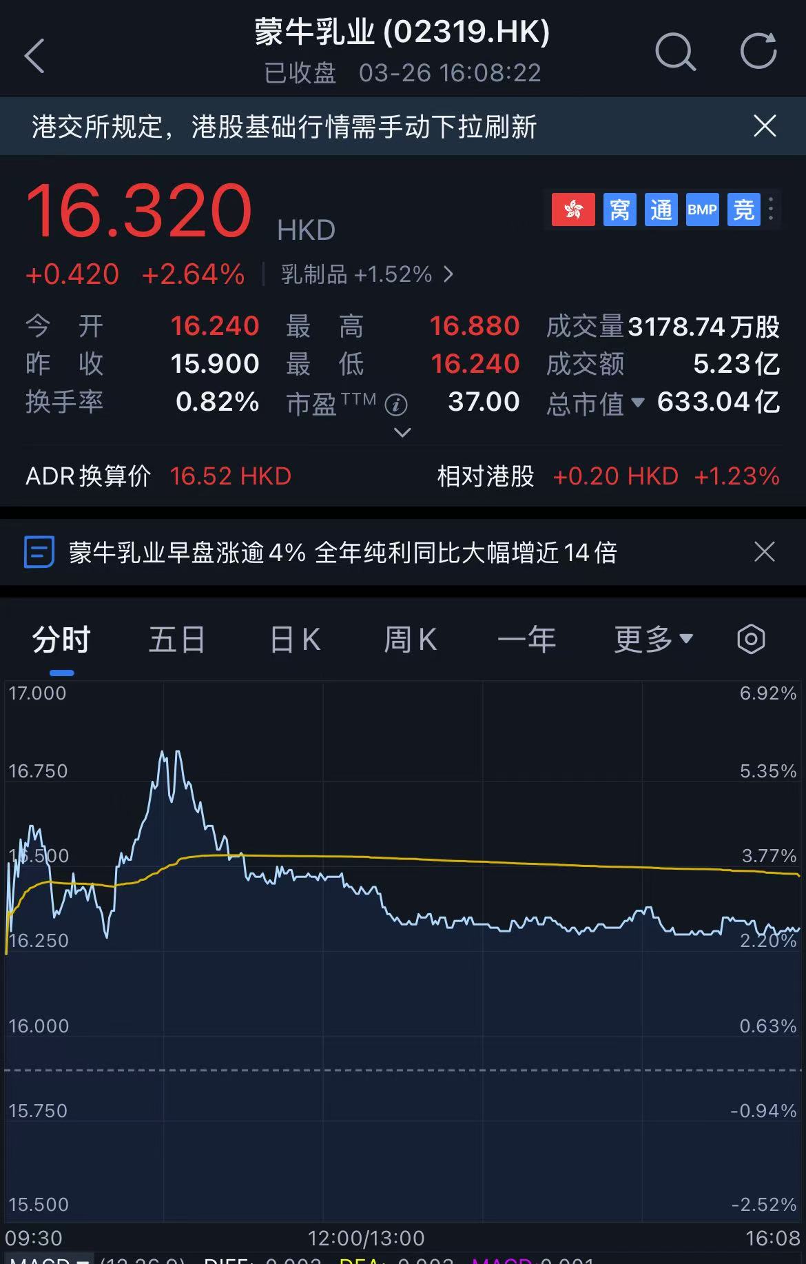 蒙牛乳业(HK2319)发布2025年业绩后,3月26日、27日连续两天逆势大涨)