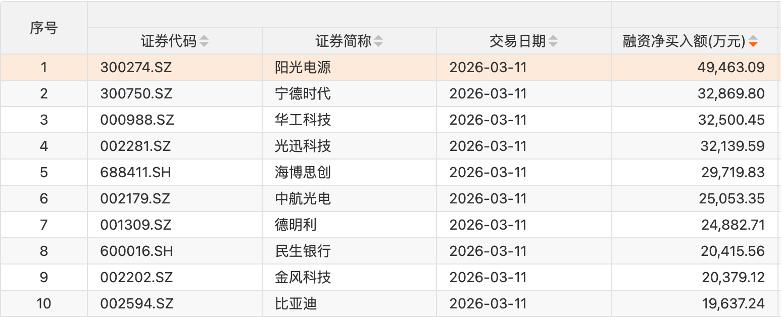 个股方面,40只个股获融资净买入额超1亿元。阳光电源(300274)获融资净买入额居首,净买入4.95亿元;融资净买入额居前的还有宁德时代(300750)、华工科技(000988)、光迅科技(002281)、海博思创、中航光电(002179)、德明利(001309)、民生银行(600016)、金风科技(002202)、比亚迪(002594)。