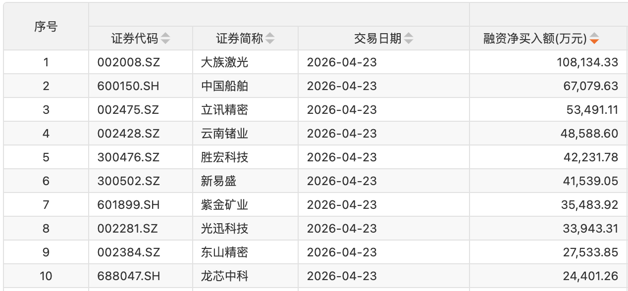 个股方面,44只股获融资净买入额超1亿元。大族激光(002008)获融资净买入额居首,净买入10.81亿元;融资净买入金额居前的还有中国船舶(600150)、立讯精密(002475)、云南锗业(002428)、胜宏科技(300476)、新易盛(300502)、紫金矿业(601899)、光迅科技(002281)、东山精密(002384)、龙芯中科等。