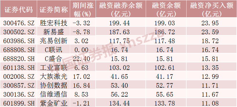 上周融资客对177只股票加仓金额超1亿元,加仓金额居前的10只股票分别为胜宏科技、新易盛(300502)、兆易创新(603986)、C联讯、C盛合、工业富联(601138)、大族激光(002008)、协创数据(300857)、信维通信(300136)、紫金矿业(601899),分别净买入23.95亿元、23.59亿元、18.72亿元、16.74亿元、15.81亿元、13.35亿元、12.99亿元、11.71亿元、11.67亿元、11.08亿元。从市场表现上看,上周融资客加仓居前十的股票多数上涨,涨幅最大的C盛合(剔除上市首日涨幅后)涨逾20%。