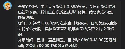 老虎证券也宣布,夜盘时段交易暂停。老虎证券称,由于美股夜盘交易上游系统异常,今日的夜盘时段已暂停交易。据了解,支持夜盘的券商均受影响,我们正在联系交易所进行沟通。为您带来的不便深感抱歉。