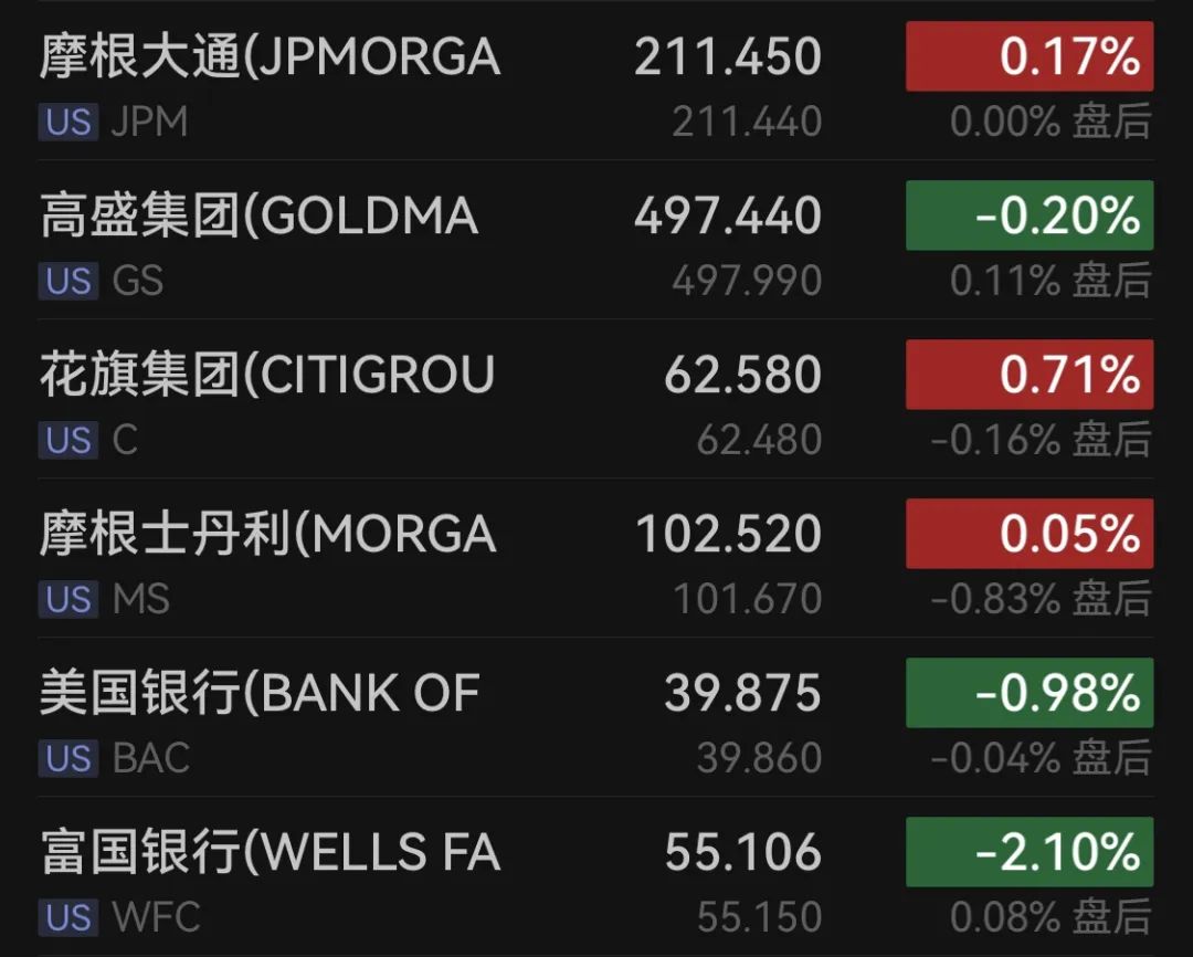 银行股涨跌互现,摩根大通跌0.17%,花旗涨0.71%,富国银行跌2.1%。