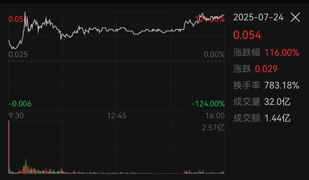 例如,记者观察到,7月24日,小型股Healthcare Triangle Inc.开盘股价飙升,截至收盘,该股涨幅达到116%。该股当日换手率高达783%,成交量和成交额分别达到32亿股和1.44亿美元,总市值为1172.20万美元(参考最新收盘价)。