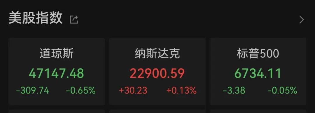 美国三大股指收盘涨跌不一。道指跌0.65%,报47147.48点;标普500指数跌0.05%,报6734.11点;纳指涨0.13%,报22900.59点。