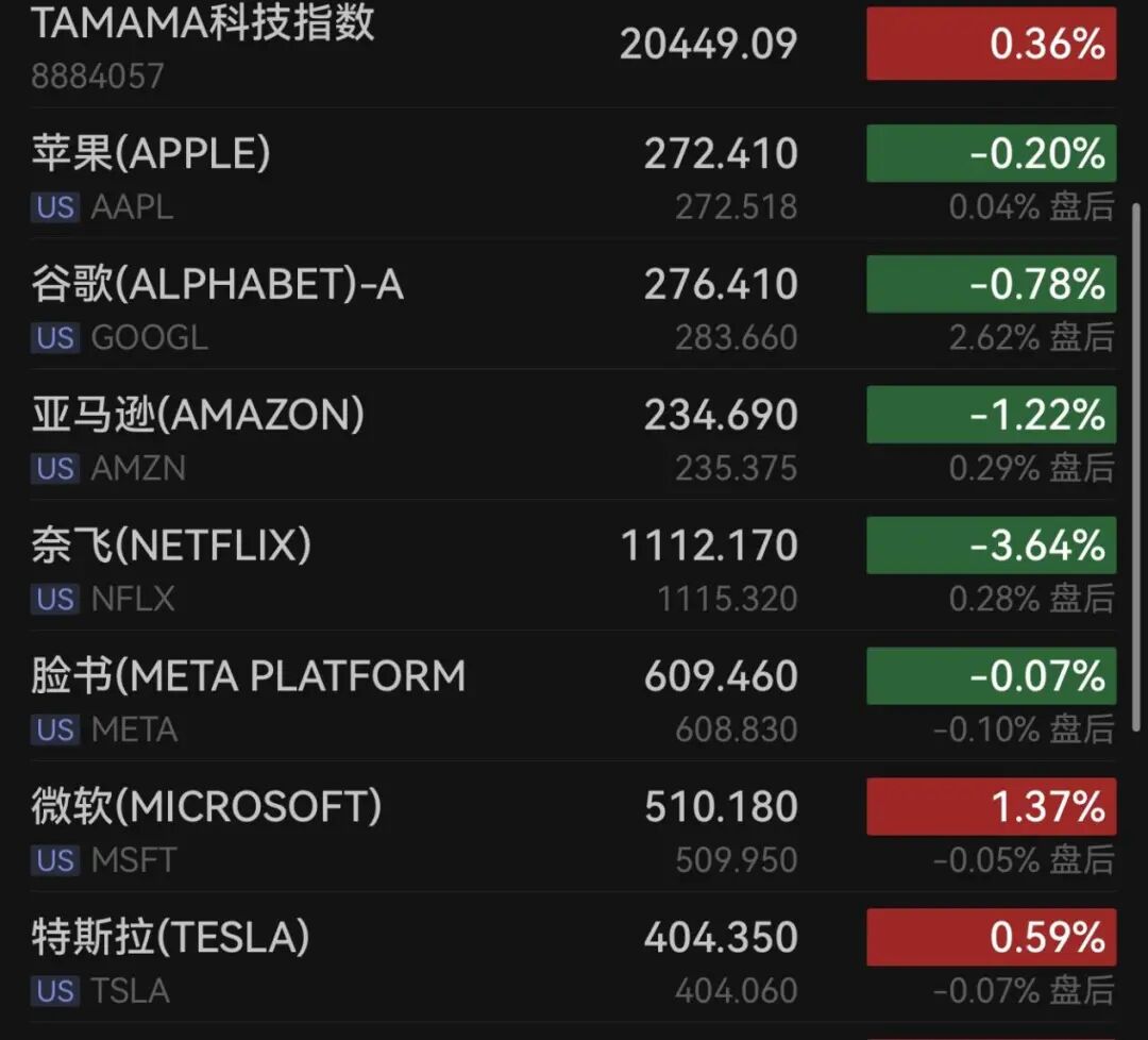 大型科技股涨跌互现。英伟达涨超1%,微软涨逾1%,特斯拉涨0.59%;亚马逊跌超1%;谷歌跌0.78%,苹果跌0.2%,脸书跌0.07%。