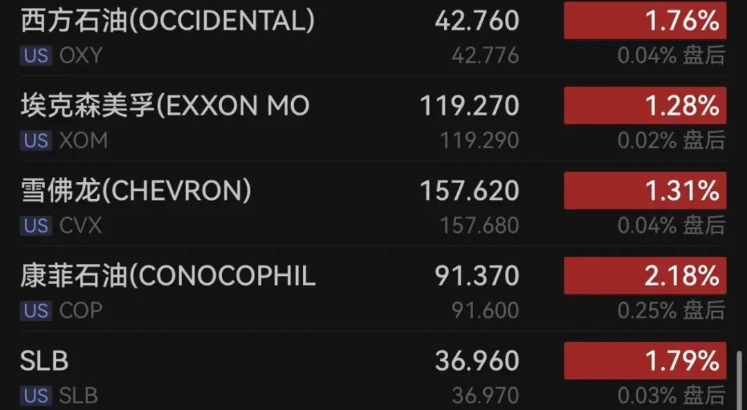 能源股集体上涨,埃克森美孚涨超1%,雪佛龙涨逾1%,康菲石油涨超2%,斯伦贝谢涨近2%,西方石油涨超1%。