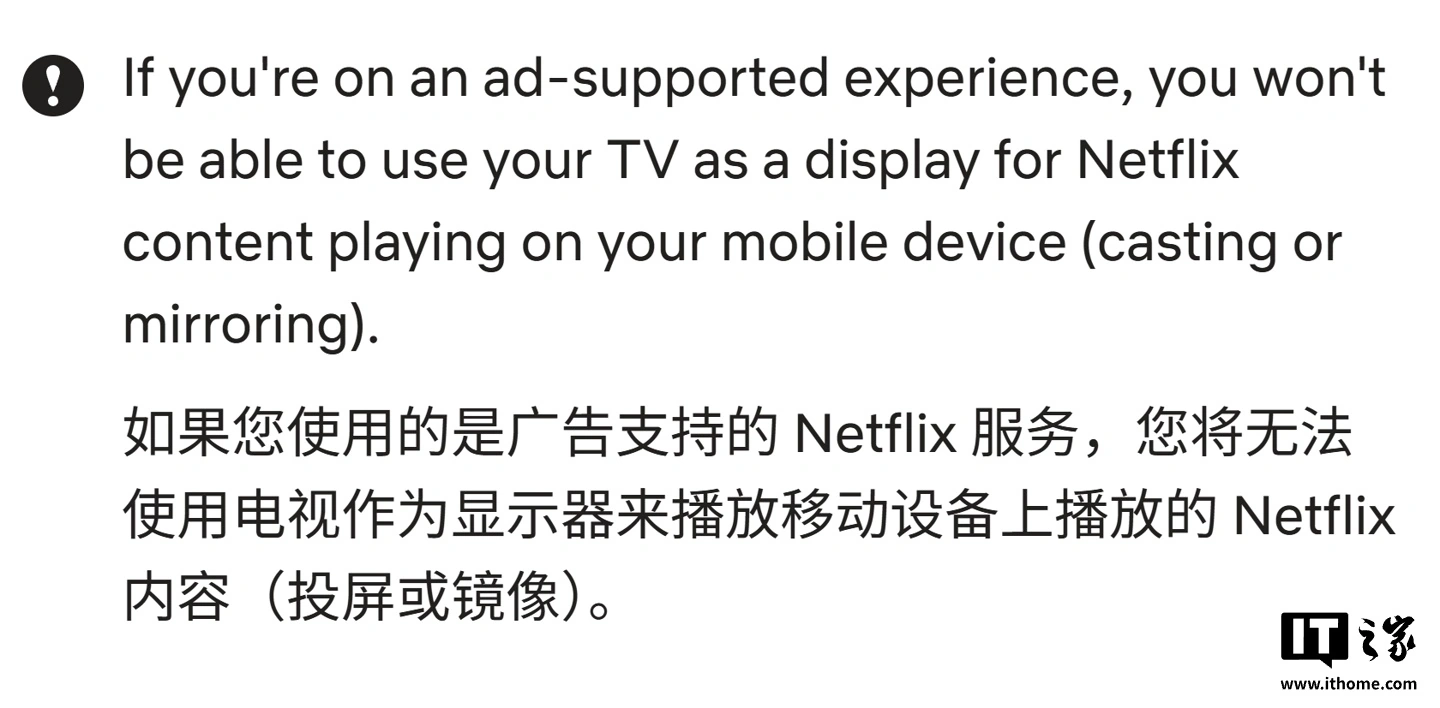Netflix 目前已更新其官方支持页面,明确界定了新的操作规范,页面声明:“Netflix 不再支持从移动设备向大多数电视及电视流媒体设备投屏。”IT之家附上相关截图如下: