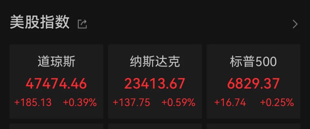 当地时间周二,美国股市三大股指小幅收涨,其中道琼斯工业指数涨0.39%,报47474.46点,标准普尔500指数涨0.25%,报6829.37点,纳斯达克指数涨0.59%,报23413.67点。