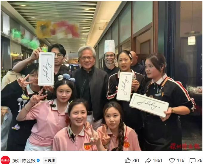 离店前,黄仁勋应店员请求合影留念,并在餐盘上签名,期间多次称赞“深圳的牛肉很新鲜,很好吃”,并表示将再次光顾。