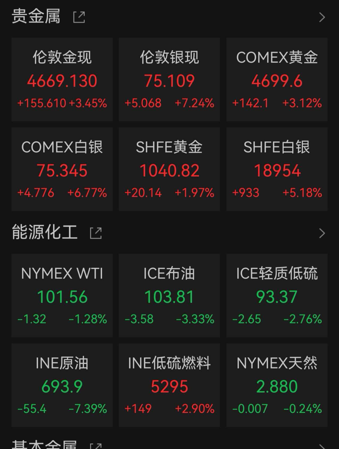 数据显示,截至北京时间4月1日5:45,伦敦金现、COMEX黄金期货分别上涨3.45%、3.12%;伦敦银现、COMEX白银期货分别上涨7.24%、6.77%;NYMEX WTI原油期货主力合约、ICE布油期货主力合约分别下跌1.28%、3.33%,报101.56美元/桶、103.81美元/桶。