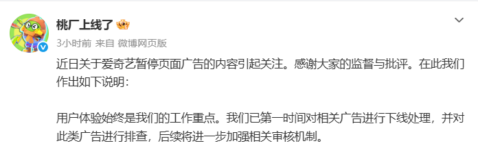 近日关于爱奇艺(IQ)暂停页面广告的内容引起关注。感谢大家的监督与批评。在此我们作出如下说明: