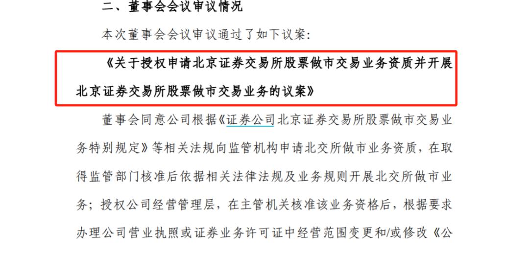 董事会同意公司根据《证券公司北京证券交易所股票做市交易业务特别规定》等相关法规向监管机构申请北交所做市业务资质,在取得监管部门核准后依据相关法律法规及业务规则开展北交所做市业务;授权公司经营管理层,在主管机关核准该业务资格后,根据要求办理公司营业执照或证券业务许可证中经营范围变更和/或修改《公司章程》涉及经营范围等相关条款的事宜(如需),以及根据法律法规、监管要求和业务发展需要组织制定相关业务制度。