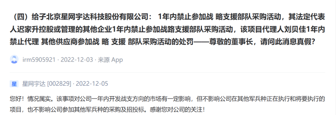 记者注意到,2022年12月5日,星网宇达(002829)在互动平台确认,其被战略支援部队处罚,禁止一年内参加战支采购活动情况属实。