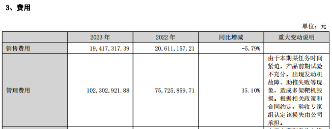 其中,星网宇达(002829)2023年管理费用1.02亿元,同比增长35.10%,主要是当期某任务时间紧迫,产品前期试验不充分,出现发动机故障、助推失败等现象,造成多架靶机毁损。根据相关政策和合同约定,验收专家组认定该损失由公司承担。