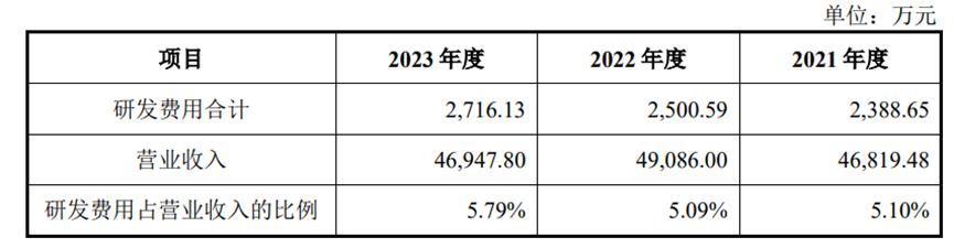 作为高新技术企业、国家级专精特新“小巨人”企业及宁波市制造业单项冠军重点培育企业,公司具备较强的自主研发能力。报告期内,公司的研发费用分别为2388.65万元、2500.59万元和2716.13万元,占营业收入的比例均超5%,研发投入整体保持较高规模,并高于同行业可比上市公司平均水平。
