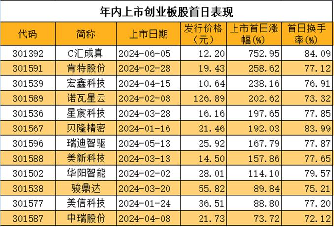 从新股首日表现看,在发行节奏明显放缓的大背景下,年内新股上市首日算术平均涨幅为114%,其中,超半数新股上市首日涨幅翻倍。创业板新股方面,年内上市创业板股首日平均涨幅为211.18%,涨幅最大的是6月5日上市的C汇成真(301392),该股上市首日高开高走,首日涨幅为752.95%,创年内新股涨幅新高。