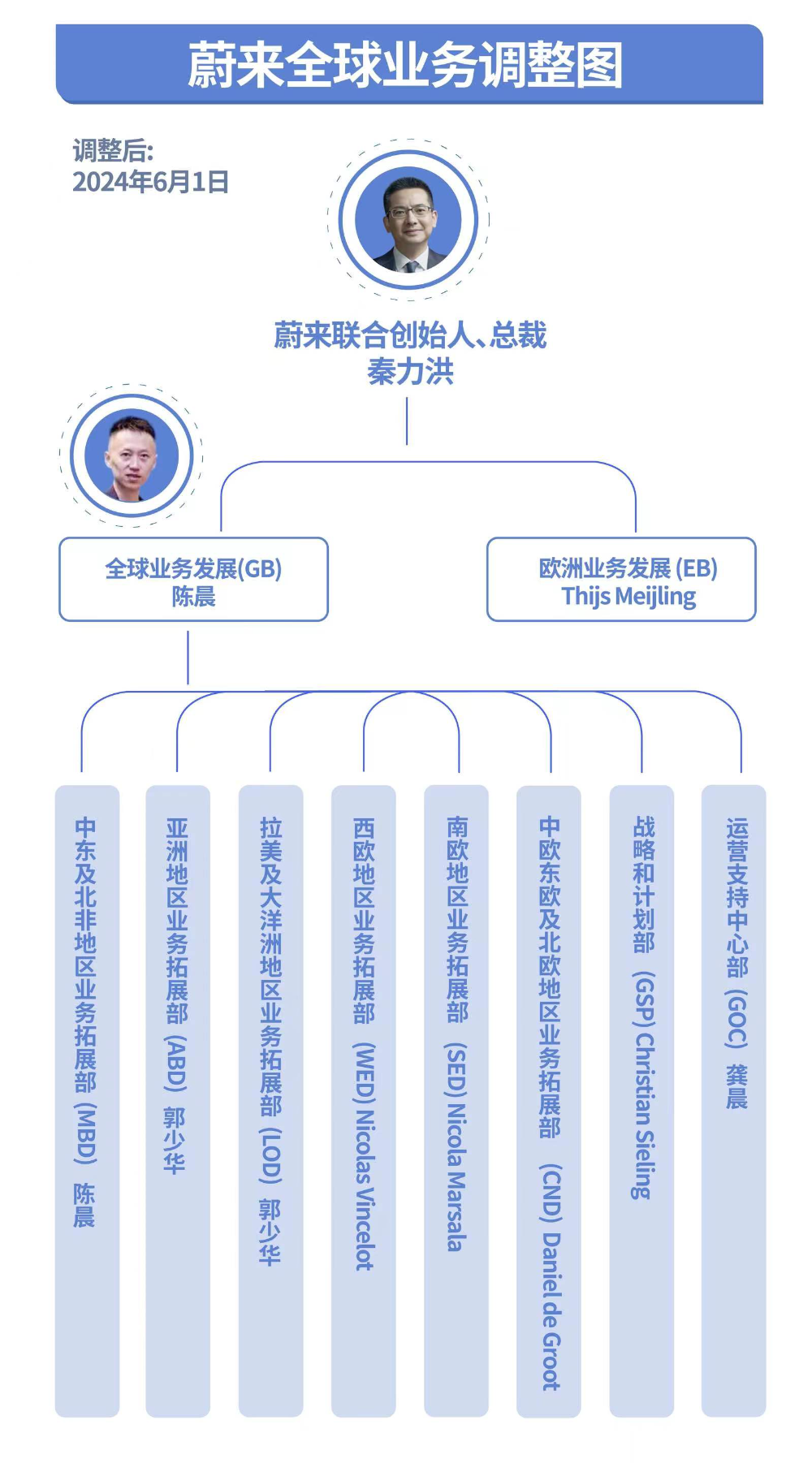 根据内部公告,蔚来新设一级部门“全球业务发展” (GB),负责多品牌及多区域全球业务的拓展,陈晨是负责人,向蔚来联合创始人兼总裁秦力洪汇报。