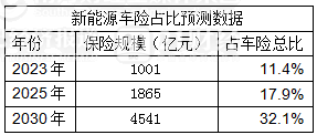 东吴证券报告显示,2023年新能源车险规模已达1001亿元。东吴证券预测,2025年,新能源车险保费规模将达1865亿元,占车险总保费比例约为17.9%;2030年,保费规模将达4541亿元,占车险总保费比例约为32.1%。
