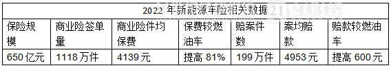 新能源汽车国家监测与管理平台数据显示,2022年,新能源车险保费规模已经达到了650亿元,商业险签单数量达1118万件,商业险件均保费4139元,较燃油车险高81%,赔付件数达199万件,案均赔款达4953元,比传统燃油车高出600元。