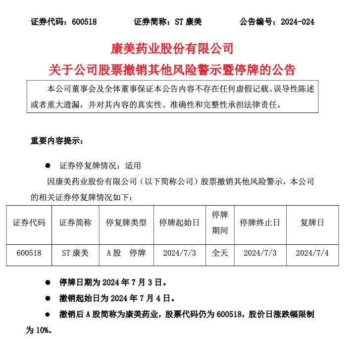 7月2日晚间,ST康美发布公告,公司股票将在7月3日停牌1天,于7月4日复牌并撤销其他风险警示。届时,公司股票将转出风险警示板交易,股票价格的日涨跌幅限制由5%变更为10%,公司股票简称由“ST康美”变更为“康美药业”。