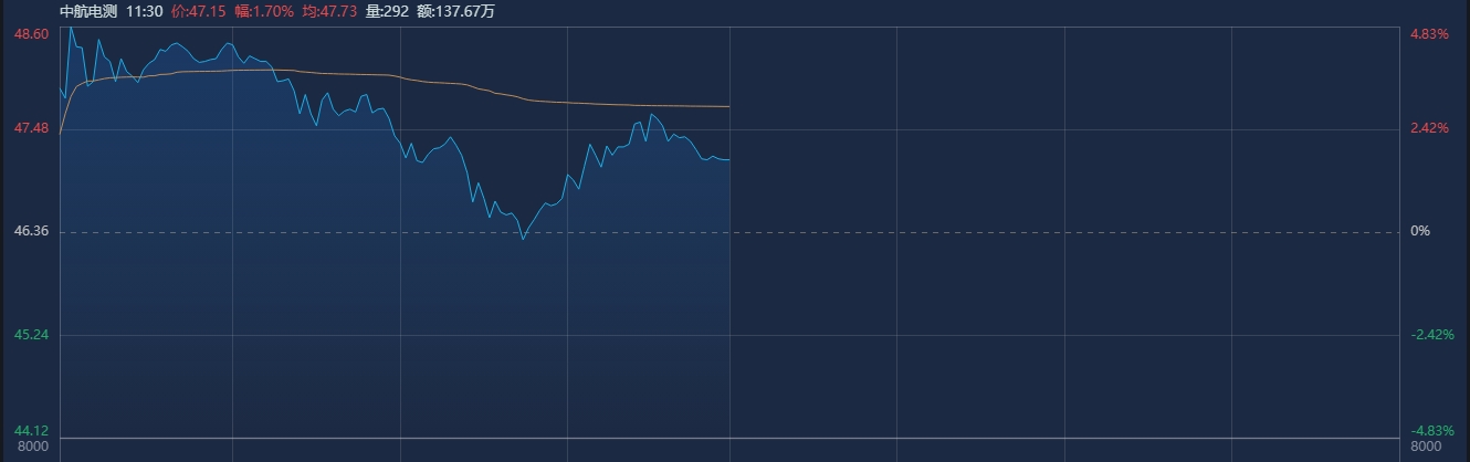 截至早盘收盘,中航电测报47.15元/股,涨幅为1.70%。