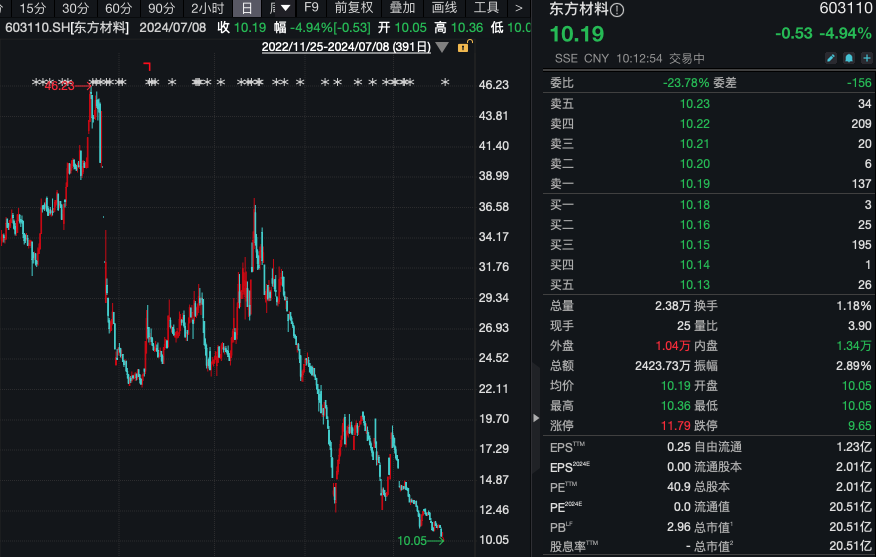 2023年4月,东方材料宣布筹划收购TD TECH时,股价曾超过40元/股;而到了2023年12月19日,东方材料宣布终止收购时,股价为26.34元/股。之后,东方材料股价继续下跌,目前最新股价为10.19元/股。