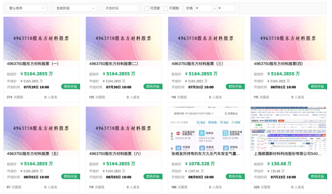 东方材料于近日通过阿里巴巴司法拍卖网络平台查询获悉,无锡市中级人民法院将从7月29日起,每天的10时至次日10时(延时除外),共分6批次公开拍卖许广彬所持有的公司2978.25万股无限售条件流通股,每天拍卖496.38万股。