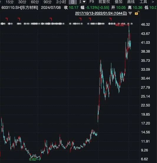 东方材料曾是A股市场的大牛股,股价从6.6元/股附近一路涨至最高超过46元/股。