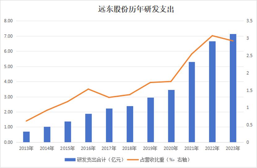 公司持续重视技术研发,2023年研发支出首次突破7亿元,创历史新高。近年来,远东股份几乎以一年增长1亿元的幅度,加大研发投入。2023年的研发支出是2019年的2.4倍。