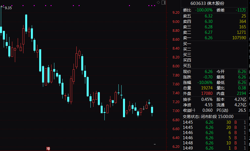 8月20日,徕木股份(603633)开盘跌停,股价报6.26元。截至收盘,徕木股份保持一字跌停状态。