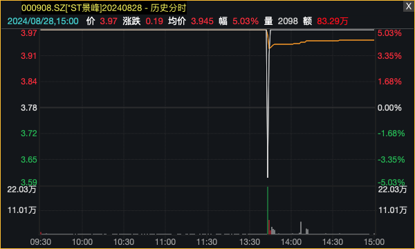 41个交易日37涨停的*ST景峰(000908)午后放巨量由涨停突然直线杀至跌停,随后又立马由跌停瞬间拉至涨停,成交由昨日的734万元猛增至2.27亿元,增加逾30倍。