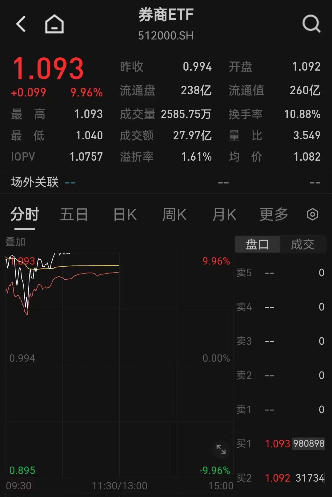 截至午间收盘,券商ETF涨停。