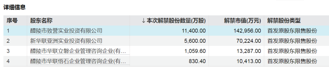 解禁市值第二大的华瓷股份,解禁股东为醴陵市致誉实业投资有限公司、新华联(000620)亚洲实业投资有限公司、醴陵市华联立磐企业管理咨询企业(有限合伙)等4个股东,其中醴陵市致誉实业投资有限公司为华瓷股份第一大股东。
