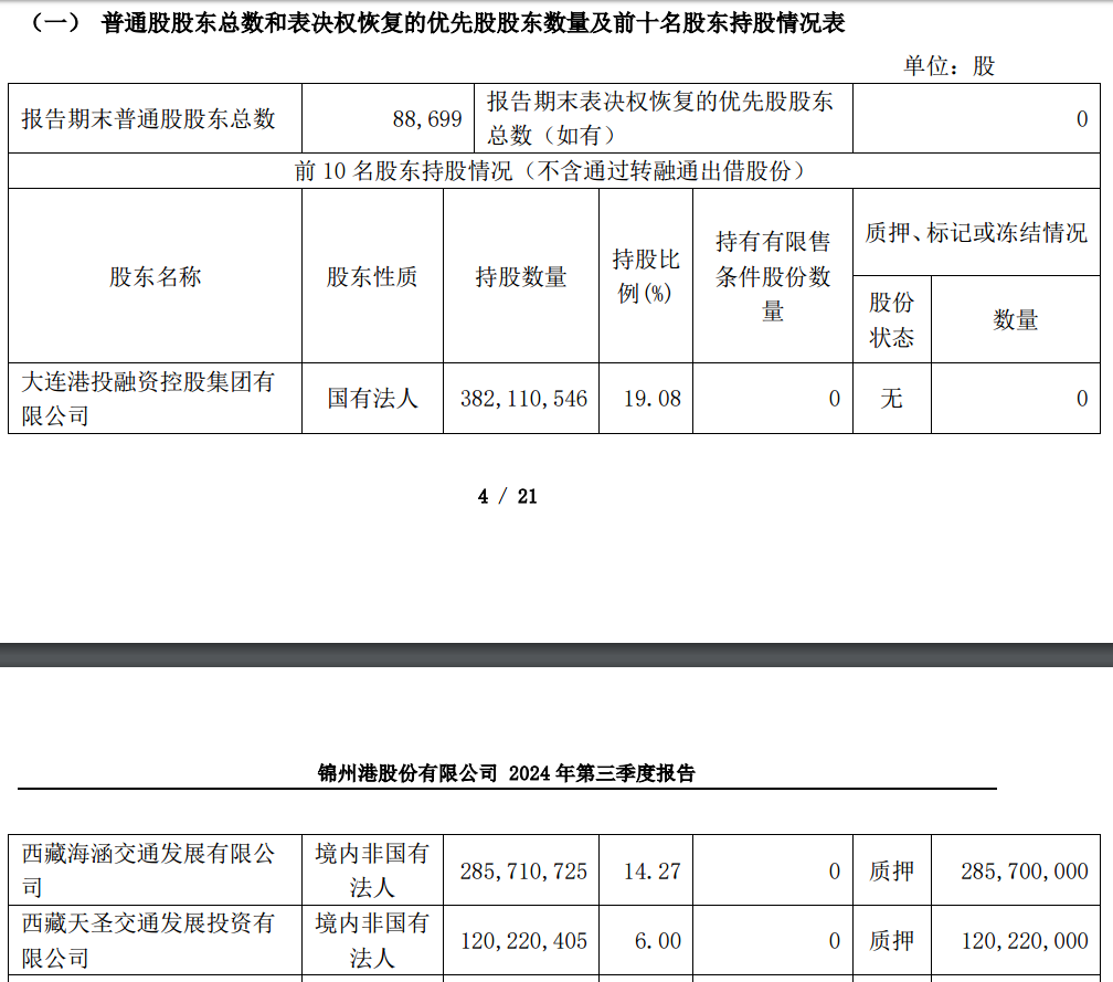 中国证监会此次立案的对象,包含海涵交通、天圣交通。截至2024年第三季度末,海涵交通、天圣交通分别是ST锦港第二、第三大股东,持股比例分别为14.27%、6%。