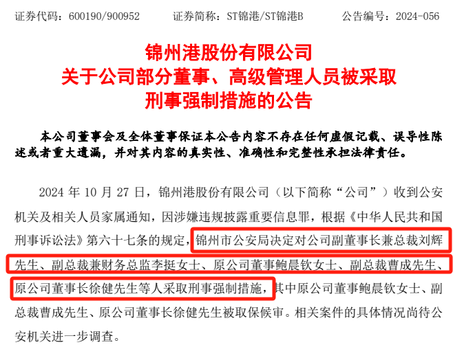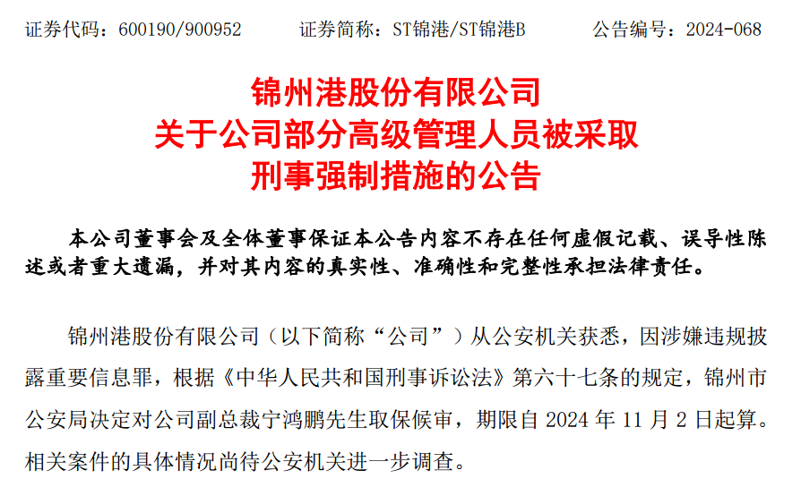 同时,ST锦港副总裁宁鸿鹏因涉嫌违规披露重要信息罪,锦州市公安局决定对其采取取保候审的刑事强制措施,期限自11月2日起计算。