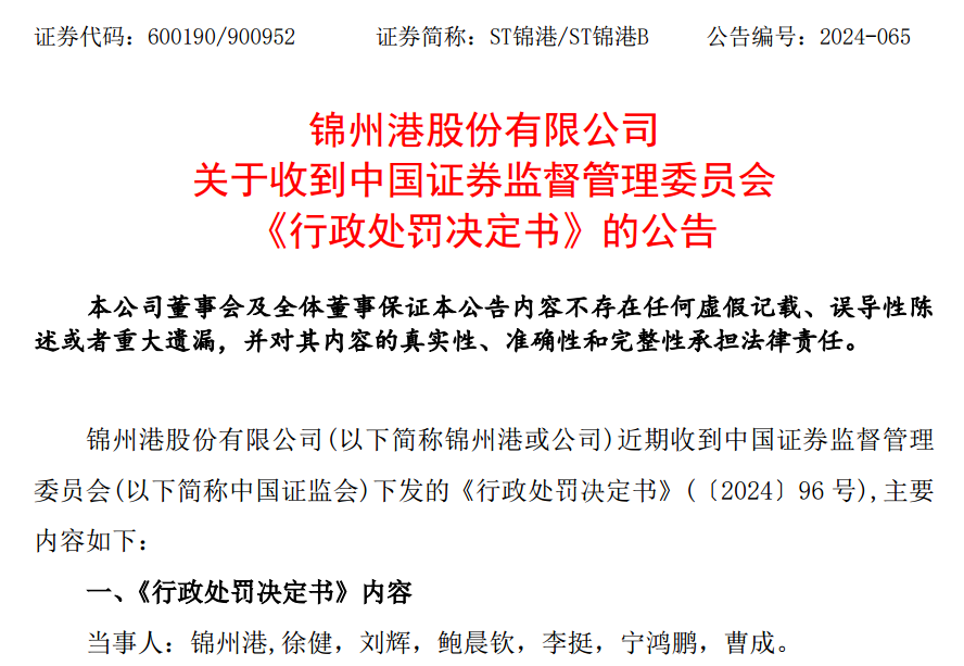 同日晚间,ST锦港公告称,公司近期收到《行政处罚决定书》。中国证监会决定对公司责令改正,并对公司及相关高管给予警告,合计处以罚款2300万元。