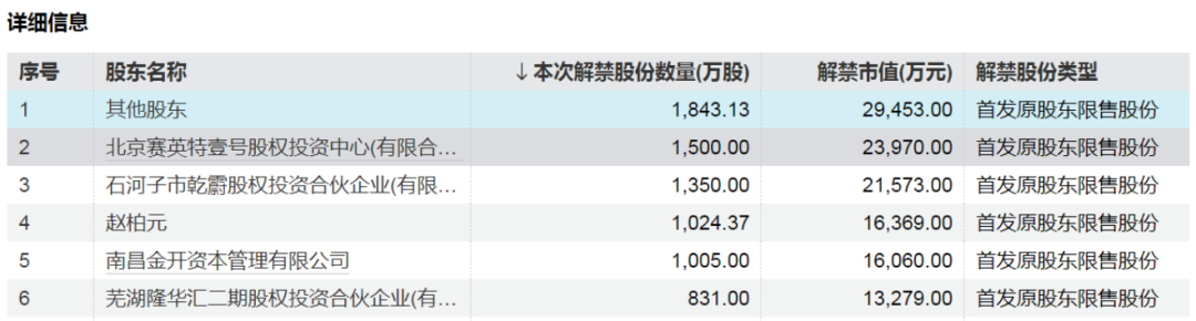 解禁市值第二大的百通能源,解禁股东为北京赛英特壹号股权投资中心(有限合伙)、石河子市乾霨股权投资合伙企业(有限合伙)、赵柏元等,其中北京赛英特壹号股权投资中心(有限合伙)为百通能源第五大股东。
